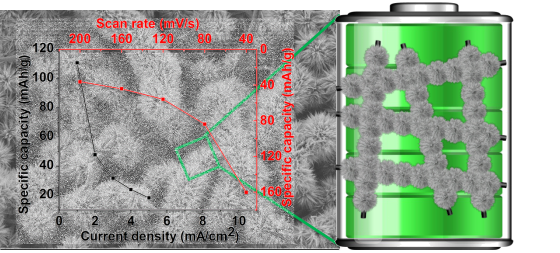 Abstract: The novel 3D rambutan-like NiCo2O4 microspheres have been successfully coated onto surface of carbon nanofibers (CNFs) to form NiCo2O4-CNFs hybrids. The composition and microstructure of NiCo2O4-CNFs were characterized by field emission scanning electronmicroscopy (FE-SEM), X-ray photoelectron spectroscopy (XPS), transmission electron microscopy (TEM) and X-ray diffractometer (XRD). The obtained NiCo2O4-CNFs exhibited a specific capacity of 160 mAh/g at 1 mA/cm2 in 2 M KOH aqueous solution. The specific capacity gradually increases with the increasing of cycles. And after 3000 cycles, the specific capacity still can be remained over 90%.