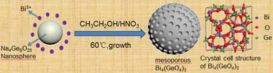 Mesoporous materials have attracted increasing attention due to their wide application. In this paper, the Na4Ge9O20 micropheres were firstly prepared by solvothermal method. Then, the as-prepared Na4Ge9O20 micropheres were dispersed into Bi(NO3)3 solution, and the Bi4(GeO4)3 microspheres with mesoporous structure were formed due to the solid state reaction between bismuth nitrate and Na4Ge9O20. The morphology, structure and optical properties were characterized by SEM, EDS, XRD, FITR, BET and UV/Vis diffuse reflectance analysis. The as-prepared products exhibited excellent photocatalytic performance for degradation of Reactive Brilliant Red X-3B (RBRX-3B) under the UV light irradiation. A possible photocatalytic mechanism was discussed as well.