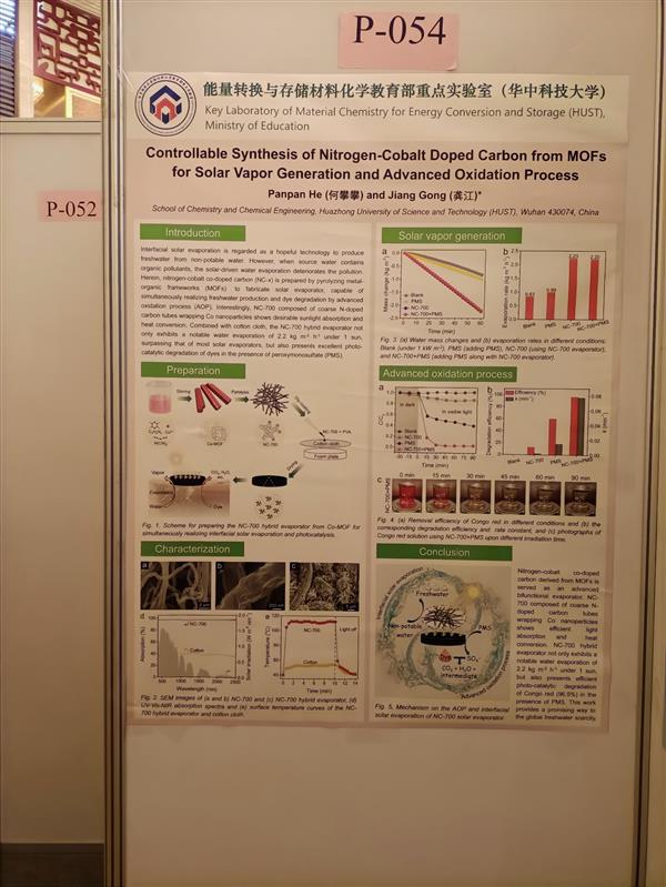 龔老師做了“廢棄聚酯基碳泡沫的高效光熱和光催化污水處理”的口頭報告,郝亮做了“Molecular Design of Biomass-Derived Hydrogel for Enhanced Solar Interfacial Evaporation”的墻報、劉寧做了“Waste Polyester-Derived C3N4-Based Intramolecular Donor-Acceptor Conjugated Copolymer for Efficient Visible-Light Photocatalysis”的墻報、白慧穎做了“Converting Waste Polyester into Fe2O3/N-Doped Carbon Foam for Simultaneously Realizing Photocatalysis Degradation and Solar Steam Generation”的墻報和何攀攀做了“Controllable Synthesis of Nitrogen-Cobalt Doped Carbon from MOFs for Solar Vapor Generation and Advanced Oxidation Process”的墻報。