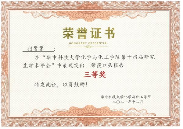 在華中科技大學化學與化工學院第十四屆研究生學術年會中,課題組2020級碩士研究生何攀攀做了題目為“黑色金屬-有機框架材料在雙功能太陽能界面蒸發和高級氧化技術中的應用”的報告,表現優異獲得口頭報告三等獎。熱烈祝賀何攀攀!!
