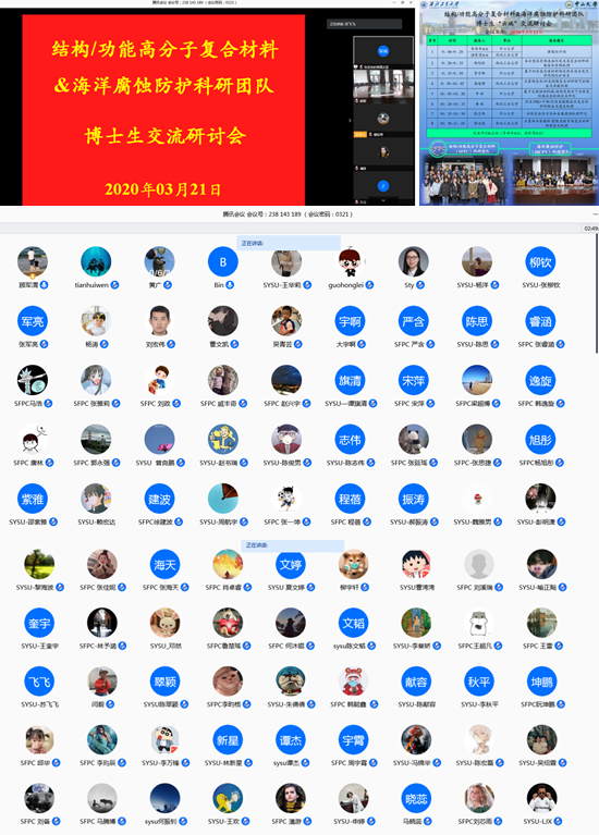 加強交流增友誼,互相學習共發展。2020年03月21日上午,西北工業大學SFPC科研團隊&中山大學海洋腐蝕防護科研團隊(Marine Corrosion & Protection Team,MCPT)博士生“云端”交流研討會順利舉行。來自中山大學化學工程與技術學院院長、國家杰出青年科學基金獲得者李偉華教授和西北工業大學化學與化工學院副院長、陜西省杰出青年科學基金獲得者顧軍渭教授兩個科研團隊的118名師生參加了本次博士生“云端”交流研討會。本次交流研討會由顧軍渭教授主持。