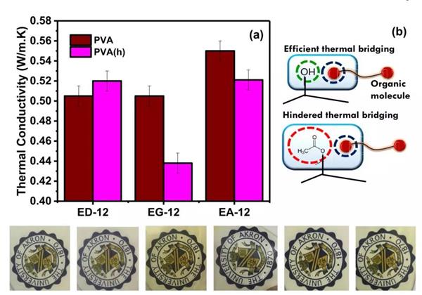 Abstract:In past decades, more research efforts have been devoted to the processing of thermally conductive polymer composite and less on fundamental aspects of heat conduction in polymeric materials. Here we presented a polymeric hybrid system comprising of polymer chain and short thermal linkers that show promising thermal conductivity and optical transparency. This was achieved by engineering their intermolecular interactions without incorporating traditional fillers (carbon, ceramic and metal). Polyvinyl alcohol (PVA) with different degrees of hydrolysis has been engineered to achieve enhanced thermal conduction by using small organic linkers (OL) having symmetric terminal groups such as ethylene diamine (ED) and ethylene glycol (EG) and hybrid terminal groups like ethanolamine (EA). Comparing with ED and EG, EA has been demonstrated more effective in enhancing thermal conductivity for both PVAs with different degrees of hydrolysis (88% and 99+%). Presence of bulkier acetate group in PVA (88% hydrolysis) restricted the efficient thermal connections by steric hindrance. Optimized pairing of terminal groups of OLs was thus found to provide an interesting handle to manipulate the thermal conductivity. Additionally, degree of hydrolysis of polymer matrix is another crucial factor to effectively engineer thermal conductivity. In summary, impact of functional group, molecular structure, side groups of backbone polymer and organic linkers were found to have substantial impact on overall thermal conductivity of PVA/OL and can be manipulated for efficient thermal management.
