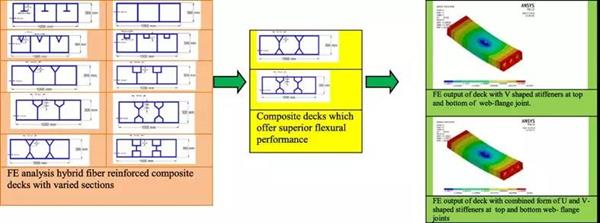 Abstract: This paper presents the experimental and analytical investigation on the behavior of hybrid fiber-reinforced composite deck made up of glass and jute fibers embedded in vinyl ester matrix. Finite element evaluation of the flexural performance of the composite decks was carried out using ANSYS, FE software. It was observed that analytical evaluation underestimates the value of deflection of deck panels 1 and 2 by 10.91% and 18.57%, respectively, when compared to the experimental results. However, the value of strain obtained by FEA is appreciably higher than that observed during the experiment. The analytical evaluation of deck panels was further extended to HYFRP and GFRP (glass fiber-reinforced polymer) decks with varied cross sections obtained by changing the location and shape of stiffeners. The specifications stipulated by Ohio Department of Transportation (ODOT), USA, for FRP decks were used for evaluating the performance of deck panels. The values of maximum deflection and strain experienced by the deck panels with stiffeners at the web-flange joint were found to be less than that of deck panels provided with stiffeners at the center of top flange of each cellular unit. Out of the various configurations examined, the performance of decks with V-shaped stiffeners and combination of U- and V-shaped stiffeners at top and bottom web-flange joint were found to be best with substantially lower deflection and strain.