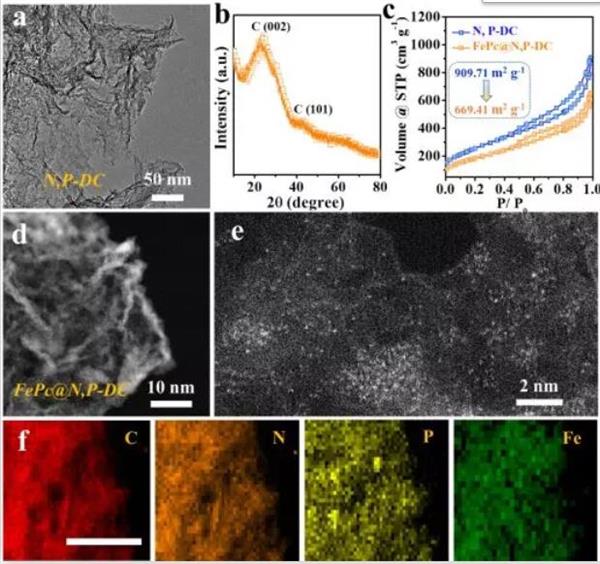 鄭州大學(xué)張佳楠教授團(tuán)隊(duì)通過(guò)傳統(tǒng)的高溫煅燒法,首先合成出富含缺陷的多孔碳材料N,P-DC。然后通過(guò)簡(jiǎn)單一步濕化學(xué)方法,將FePc小分子錨定其上。通過(guò)控制負(fù)載過(guò)程與摻量,確保FePc呈單原子分散。