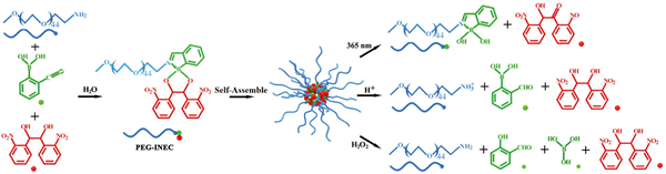 multi-component reaction (MCR) of methoxypolyethylene glycol amine (mPEG-NH2), 2-formylphenylboronic acid (FPBA), and bis(2-nitrophenyl) ethanediol (BNPE, a photo-cleavable nitrobenzyl alcohol derivate). The aqueous MCR synthetic procedure is followed using 1H NMR and turbidity analysis. It is shown that polymer nano-aggregates of PEG-INEC in aqueous solution can be dissociated through the stimuli responsive reactions of the hydrophobic iminoboronate nitrobenzyl ethanediol chelates (INECs) when exposed to UV light, acid, and H2O2, respectively. Furthermore, upon the stimulation of combined triggers, the dissociation of polymer nano-aggregates can be accelerated to different extents, resulting in the synergistic release of encapsulated hydrophobic molecules in water. The proposed facile and general method is quite desirable and of great importance in practical applications like drug and gene delivery.