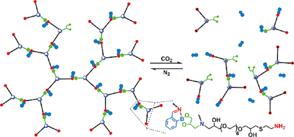 Due to the very weak acidity of CO2 in water, the trigger of CO2 is always used to tune the physico-chemical properties of polymeric materials through the protonation of organic bases rather than the hydrolysis of acid-labile moieties contained in polymeric structures. Herein, a novel strategy of gasswitchable lower critical solution temperature (LCST)-type hyperbranched polymer of iminoboronate-linked hyperbranched poly(oligo-(ethylene glycol)) (IB-hPOEG), by employing CO2-acidolyzable iminoboronates as linkers and protonable tertiary amines as branch points, is presented. Upon alternative CO2 and N2, iminoboronates are partially reversibly hydrolyzed and tertiary amines are repeatedly protonated. This leads to a tunable thermo-responsive behavior of IB-hPOEG aqueous solution with a broad range of Tcp at 28–78 °C intervals by varying the molar ratio of boronic acid, polymer concentration, or bubbling of CO2 and N2. This gas-controllable LCST-type hyperbranched polymer with CO2-hydrolyzable iminoboronates is believed to have a promising potential for advanced biomedical and material applications such as drug delivery, gene transfection, functional coatings, etc.