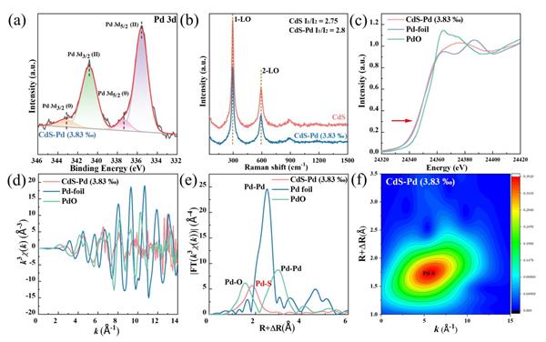 通過簡單的一步誘導還原法將單原子Pd修飾在六方相CdS NPs表面,優化并制備出一種CdS-Pd納米光催化劑。通過XRD、Raman、XPS、XAFS和ac-STEM等表征研究發現:貴金屬Pd是以單原子狀態均勻分布在CdS 納米催化劑表面,且單原子Pd與CdS 納米催化劑表面的S原子形成了S-Pd配位作用,這有利于促進光誘導載流子的傳導。