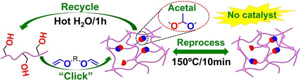 Dynamic covalent networks offer favorable features of cross-linked polymers as well as functions of reprocessing, recycling, self-healing, reshaping, and welding; however, it is a challenge to design readily monomer-recovery, highly malleable, catalyst-free dynamic materials. Here we report the first design of acetal dynamic networks to address this challenge. Acetal dynamic networks were built via catalyst-free “click” addition of polyol and a commercial divinyl ether without releasing small molecules. Small-molecule model compounds demonstrated thermally-induced acetal exchange without catalyst. There are two mechanisms for the dynamic exchange of acetal: one is metathesis of acetal, another is transacetalization. Acetal dynamic covalent networks exhibited excellent malleability and recyclability. They presented rapid stress relaxation at high temperature. Hot press recovery can be achieved in 10 min at 150 °C. Meanwhile, the starting material was recovered with 92% recovery in 1 h under hot water treatment at 100 °C, and could be recross-linked with a commercial divinyl ether to obtain acetal network. The acetal networks recovered by the two methods maintained the original structure and performance. Acetal dynamic linkage will open up a new way for the development of catalyst-free dynamic covalent networks and enrich the acetal chemistry.