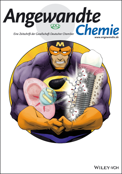 Enhanced cell growth occurs on a titanium surface modified with insulin-like growth-factor-1 prepared by a bioorthogonal approach combining protein engineering and enzyme modification, as shown by Y. Ito and co-workers in their Communication (10.1002/anie.201603155). The picture shows a peptide sequence (center), which is inspired by an underwater adhesion protein (represented as a strong man) secreted by mussels, binding to a dental implant?(right) representing titanium-based medical devices, and to a growth factor stimulating a cell through the receptor?(left).