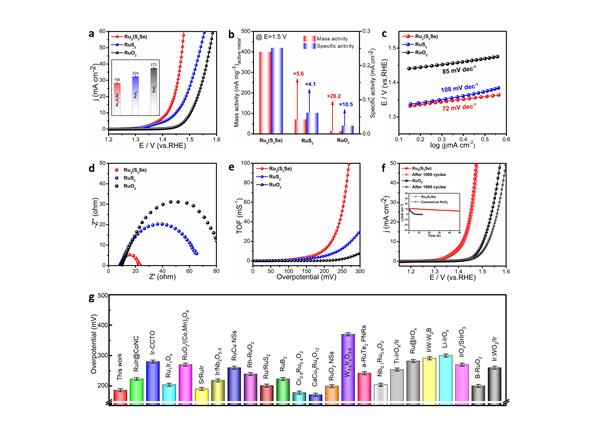 電子結構表征方面(圖2),作者首先通過XPS分析,證明了Ru2(S3Se)樣品中Se元素的存在。另外,相較于純相RuS2,Ru2(S3Se)樣品中Ru的峰向低能量方向發生了偏移,這是由于Se較低的電負性所導致的。XANES數據進一步證明了Ru2(S3Se)樣品中Ru價態的降低,這有利于提升OER的活性和穩定性。EXAFS數據證明了Ru2(S3Se)樣品中存在Ru-S和Ru-Se鍵,相應的擬合結果也說明Ru的配位環境更加豐富。通過上述電子結構分析,Se的引入作為能夠有效的優化電子結構,使得更多的電子富集在Ru活性位點附近,其配位環境也通過形成Ru-S和Ru-Se鍵得到有效調控,有利于后續OER活性和穩定性的優化。