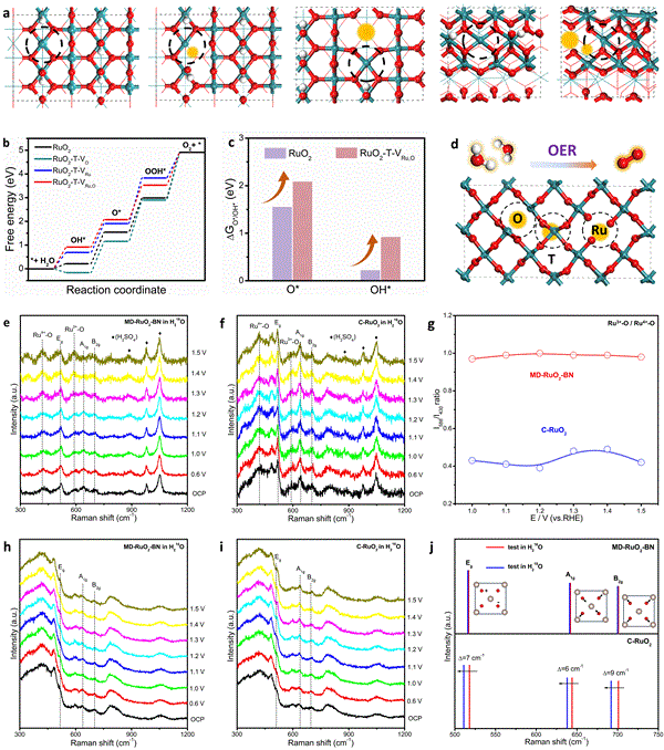 該研究提出了一種由多尺度缺陷RuO2納米單體組成的雙連續納米反應器(MD-RuO2-BN),并通過三維層析重建技術進行了驗證。獨特的雙連續納米反應器結構通過空腔約束效應提供了豐富的活性位點和快速的傳質能力。此外,現有的空位和晶界賦予了MD-RuO2-BN大量的低配位Ru原子,削弱了Ru-O相互作用,抑制了晶格氧的氧化和高價Ru的溶解。因此,在酸性介質中,電子和微觀結構同步優化的MD-RuO2-BN實現了超高水氧化活性(196mV@10mA·cm-2)和超低降解率(1.2mV·h-1)。使用MD-RuO2-BN作為陽極的自制PEMWE也具有很高的水分解性能(1.64V@1A·cm-2)。理論計算和原位拉曼光譜進一步揭示了MD-RuO2-BN的電子結構和水氧化過程的機理,并通過多尺度缺陷和受保護的活性Ru位點的協同效應合理解釋了性能的提高。