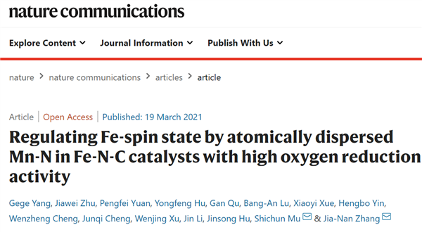Yang, G., Zhu, J., Yuan, P. et al. Regulating Fe-spin state by atomically dispersed Mn-N in Fe-N-C catalysts with high oxygen reduction activity. Nat. Commun. 2021, 12, 1734. https://doi.org/10.1038/s41467-021-21919-5