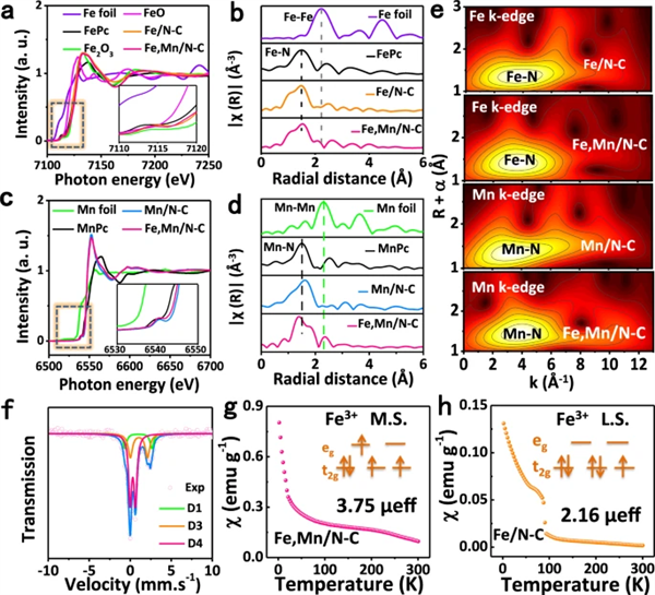 DOS研究結果表明,Fe和Mn之間的相互作用主要是由于3d軌道。Fe、Mn/N-C催化劑中的Mn-N結構能夠通過自旋態過渡和電子調控有效活化相鄰的FeⅢ位點。Fe 3d和Mn 3d之間有明顯的重疊,電子親和力較高的MnII能夠從FeII中捕獲電子,導致Fe 3d中的電子重新分布。此外,Fe 3d和Mn 3d的軌道雜化使Fe、Mn/ N-C的能帶隙明顯縮小以及電子離域,增加了導帶色散,減小了較大的有效電子質量,從而改善了電子輸運。通過磁性測試和理論計算得出。