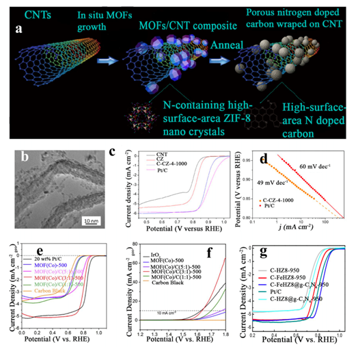 圖3. (a) 從MOF/CNT復合材料開發高表面積N摻雜碳的示意圖,(b) C-CZ-4-1000、CNT、C-ZIF-1000的低倍TEM圖,(c) LSV曲線,(d) Tafel (Carbon 2015, 82, 417-424);(e) ORR的LSV曲線,(f) OER的LSV 曲線(Electrochim. Acta 2019, 295, 966-977);(g) 在0.1 M KOH中的LSV 曲線(J. Mater. Chem. A 2019, 7, 5020-5030)。