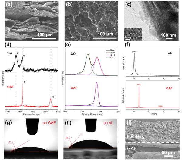 圖 2. (a) GAF 的橫截面 SEM 圖像。(b) GAF 的表面形態。(c) 剝離的 GAF 的 TEM 圖像。插圖:部分放大的圖像。(d) 未退火的 GO 膜和 GAF 的拉曼、(e) XPS 和 (f) XRD 圖案比較。(g, h) LiFePO 4漿料在 GAF 上滴落 (g) 和 (h) 在鋁箔上的接觸角。(i)干燥后涂覆在 GAF 上的 LiFePO 4陰極的橫截面 SEM 圖像。