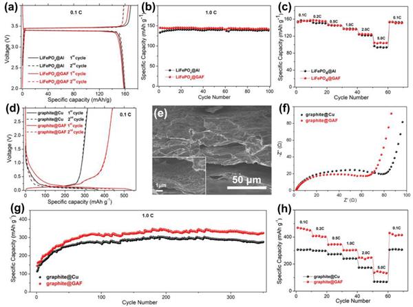 圖 3. (a) 初始兩個循環的充放電曲線。(b) LiFePO 4 /GAF 和 LiFePO 4 /Al 電極的循環性能和 (c) 倍率性能。(d) 石墨/GAF 和石墨/Cu 電極初始兩次循環的充放電曲線。(e) 20 次循環后石墨/GAF 電極的 SEM 圖像。(f) 石墨負極在不同集電器上的 EIS。(g)石墨/GAF和石墨/Cu電極的循環和(h)倍率性能。