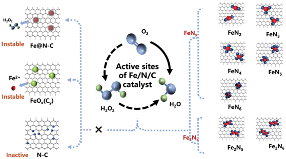 圖1. Fe-N-C模型催化劑的不同活性位點與穩定性關系,以及衰減機理和穩定性提升策略