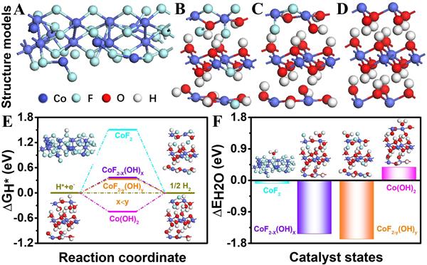 Figure 5. (A-D) Optimized structure models, (E) Calculated free energy diagram (inset, optimized H* adsorption structure models) and (F) H2O adsorption energy diagram (inset, optimized H2O adsorption structure models) of CoF2, CoF2-xOHx, CoF2-y(OH)y, and β-Co(OH)2.