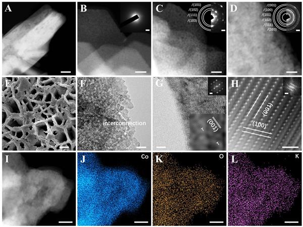 Figure 5. (A) HAADF-STEM image of initial CoF2. (B-D) HAADF-STEM images of CoF2 at point A-C (inset, SAED pattern).(E) FESEM, (F) TEM, (G) HRTEM (inset, local FFT-filtered HRTEM image, FFT pattern) and (H) atomic-resolution HAADF-STEM (inset, FFT pattern) images of CoF2 at point C.(I-L) HAADF-STEM image and corresponding EDS elemental mappings of CoF2 at point C. Scale bar: A 50 nm; B-D 10 nm, 2 nm-1 (inset); E 200 nm; F 10 nm; G 5 nm, 2 nm-1 (inset); H 1 nm, 5 nm-1 (inset); I-L 50 nm.