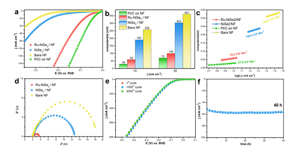制備的Ru-NiSe2/NF在OER、HER和全水解中表現(xiàn)出非常高的活性。在堿性介質(zhì)中,當(dāng)電流密度為10 mA cm-2時(shí),其OER過電位僅為210 mV,HER僅為59 mV,全水解所需電壓低至1.537 V;此外,無論是OER、HER還是全水解,該催化劑均保持了高的電化學(xué)穩(wěn)定性。
