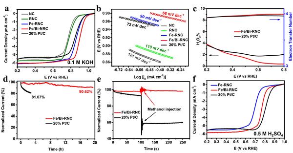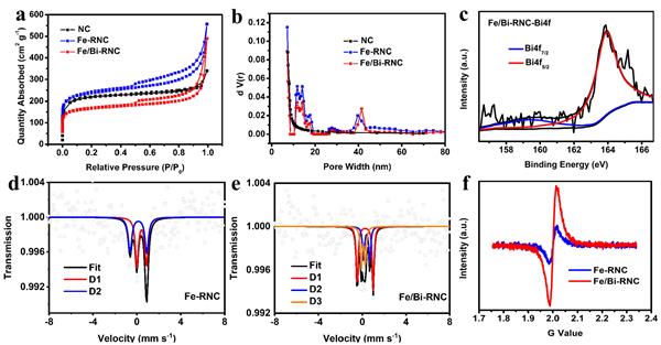 文章要點2:Mssbauer譜和電子順磁共振測試證明,Bi摻雜可以導致Fe/Bi-RNC中形成更高活性的Fe–N位點。因此,在堿性和酸性電解液中,所制備出的Fe/Bi-RNC催化劑表現出遠優于未摻雜BiFe-RNC催化劑的ORR性能。