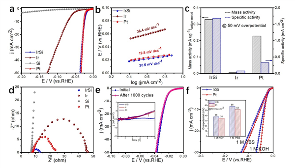 我們在相同條件下對IrSi和對比樣品(Si、Ir和商業Pt黑)進行了系統的HER性能測試。結果表明,IrSi具有和商業Pt黑相當的HER活性且擁有快速的動力學過程。令人印象深刻的是,當過電位為50 mV時,IrSi的質量活性分別是Ir和Pt的54.8倍和1.5倍,比活性分別是Ir和Pt的21.1倍和5.1倍。此外,金屬間化合物IrSi在酸性介質中也具有優異的穩定性。