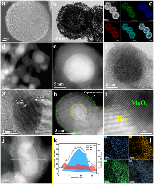 由于高過電勢,水電解制氫受到高能耗的極大限制,迫使人們不得不開發能夠有效催化水分解反應的催化劑。然而,目前大多數過渡金屬基催化劑只能在堿性環境中使用,因為它們大多在酸性和高氧化環境中不穩定,而且用途單一。因此,尋找在寬pH范圍內具有高析氫和析氧反應動力學的穩定雙功能催化劑是一個巨大的挑戰。基于此,武漢理工大學木士春課題組進行了雙功能Ru@MoO(S)3設計并構建了適用于寬pH范圍的納米膠囊結構電催化劑,其中Ru納米粒子包裹在硫調制的氧化鉬(MoO(S)3)殼中。