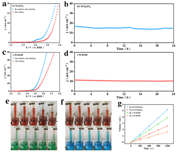 這是首次報道催化劑在酸性和堿性介質中具有幾乎相同的水分解活性,并且顯著超過了商業 Pt/C和RuO2催化劑。電化學阻抗譜數據表明,Ru@MoO(S)3在OER中的Rct最小,在HER中非常接近Pt/C,表明Ru@MoO(S)3具有更快的OER和HER電子轉移過程;此外,在24 h恒流水分解試驗中,Ru@MoO(S)3的電流密度衰減非常小。因此,該工作進一步豐富了通用水電解催化劑的研究體系,為開發先進的酸性質子交換膜和堿性陰離子交換電解槽等高效儲能轉換裝置提供了指導。