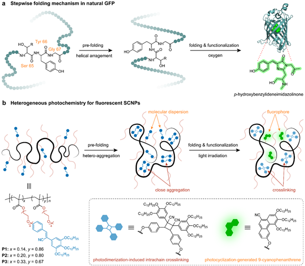 本研究合成了一類新型含氰基苯乙烯(CS)基元的兩親性無規共聚物。當該共聚物在水溶液中進行預折疊時,聚合物鏈中隨機分布的CS基元表現出獨特的異質聚集行為,具體表現為兩種不同的聚集狀態:緊密聚集態和單分子分散態。值得注意的是,處于緊密聚集態的CS基元能夠發生光二聚化反應,從而實現分子內交聯;而單分子分散態的CS基元則可通過光環化反應生成具有強綠色熒光的熒光團。這種獨特的雙態特性使CS基元兼具鏈內交聯劑和熒光功能基團的雙重功能,通過雙重光化學路徑的協同作用,成功實現了SCNP的鏈內折疊和熒光功能化。