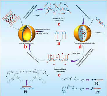 (1) 課題組利用β-環糊精和偶氮苯的主客體包合作用、以及原子轉移自由基聚合法構筑了具有支化拓撲結構的超分子共聚物。在紫外光-可見光的交替作用下,此聚合物在水溶液中的自組裝形貌可實現從空心囊泡到實心膠束的可逆轉化,此過程中伴隨著超分子聚合物的解離與重構。課題組進一步利用以上可逆的自組裝形貌轉化特性實現了對抗癌藥物阿霉素的“開-關”控釋 (Chem.Commun., 2015, 51, 15366-15369;被選作內封底展示論文)。以上研究結果為超分子支化聚合物作為藥物載體在生物醫學領域的應用提供了可能性。