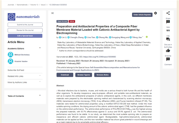 焦體峰教授課題組Nanomaterials: Preparation and Antibacterial Properties of a Composite Fiber Membrane Material Loaded with Cationic Antibacterial Agent by Electrospinning