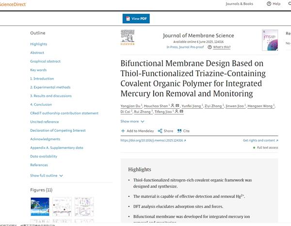 焦體峰教授課題組Journal of Membrane Science: Bifunctional Membrane Design Based on Thiol-Functionalized Triazine-Containing Covalent Organic Polymer for Integrated Mercury Ion Removal and Monitoring
