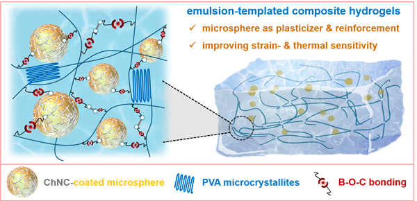 A Pickering emulsion-templating method is developed for preparing composite hydrogels with improved mechanical properties and ionic conductivity. First, an aqueous system with poly(trimethylolpropane triacrylate) microspheres coated with chitin nanocrystals (ChNCs) is prepared using an oil-in-water emulsion template by means of photo-cross-linking. Thereafter, the system is mixed with poly(vinyl alcohol) (PVA) and borax solutions, followed by freeze-thawing treatments. The as-prepared hydrogels exhibit two types of characteristic cross-links, physical cross-links caused by the crystallization of PVA, and chemical cross-links caused by the occurrence of boronic ester (B-O-C) bonding between PVA chains and ChNC-coated microspheres. Microspheres serve to simultaneously reinforce and plasticise the hydrogel system. The strength and elongation of the microsphere-containing hydrogel are 676 kPa and 600%, respectively, considerably higher than those of the microsphere-free hydrogels (350 kPa and 350%). The volume exclusion effect of microspheres also enhances ionic conductivity, resulting in improved strain and thermal resistances. Therefore, the emulsion-templated hydrogel sensor is deemed more suitable for probing deformation with large strain in comparison with the microsphere-free hydrogel sensor. This study proposes an effective way of using ChNC-stabilized Pickering emulsions to template mechanical properties and sensing abilities of hydrogel-based strain sensor.