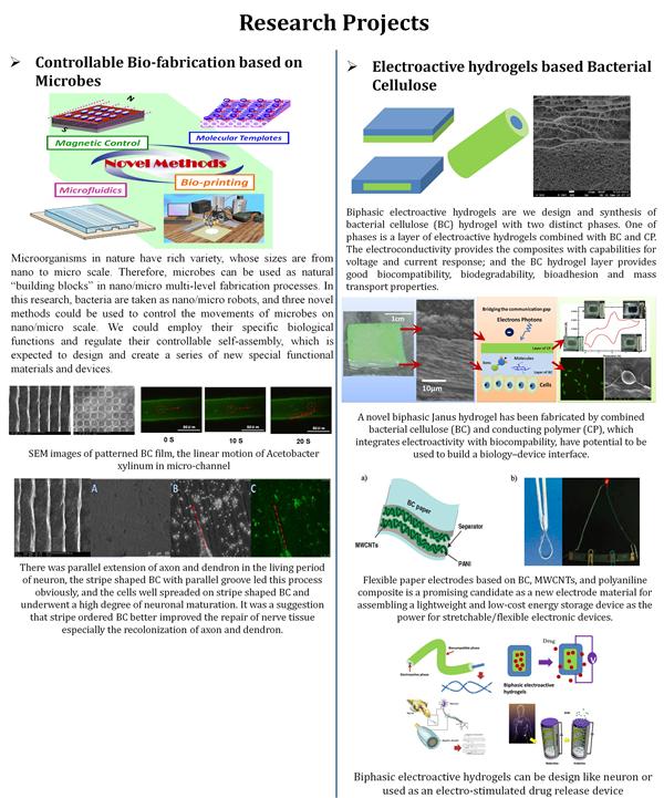 Biochemical engineering, Bionic nano-composite, Polymer physics & chemistry, involving in study on nano-assembly of ordered eco-friendly materials and their structures & properties, proceeding control and optimization of bio-refining, design and fabrication of novel nano-drug transporter, tissue engineering scaffold materials for biomedical applications, etc.