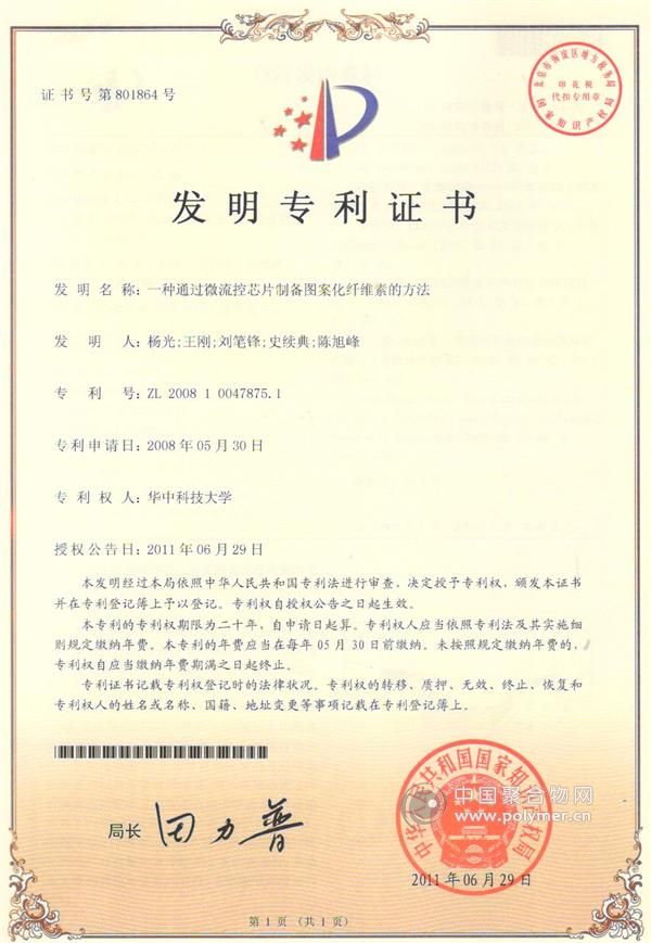 本發明提供了一種通過微流控芯片制備圖案化纖維素的方法,按照以下步驟進行:(1)依據預定圖案制作陽膜;(2)制備與陽膜圖案相匹配的聚二甲基硅氧烷(PDMS)模塊;(3)在PDMS模塊上打孔,將潔凈的載玻片壓緊于PDMS模塊有圖案的一面,形成微流控芯片,其中PDMS模塊上的圖案化管道通過孔與外界相連通;(4)在兩儲液槽中裝入細菌培養液,利用導管將微流控芯片的圖案化管道分別與兩儲液槽連通,調節兩儲液槽之間的液面差控制圖案化管道內的液體流速,其液面差為1-20cm,培養5-20天,揭開PDMS模塊,得到圖案化纖維素。采用本發明制得的細菌纖維素材料具有微觀的有序性和宏觀的圖案性,并兼有生物相容性和生態相容性,是理想的環境友好材料。