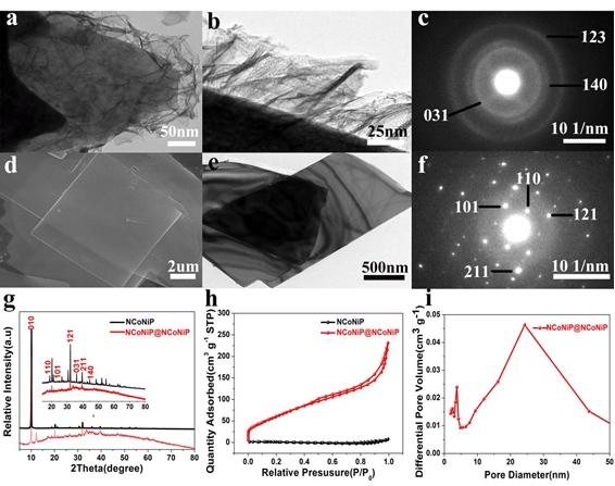 圖2 (a-b)NCoNiP@NCoNiP核殼結構的TEM圖;(c)為NCoNiP@NCoNiP核殼結構的SAED圖;(d-e)圖為NCoNiP的TEM 圖; (f) NCoNiP結構的SAED圖;(g)NCoNiP@NCoNiP和NCoNiP 的XRD圖;(h)NCoNiP@NCoNiP and NcoNiP的N2吸脫附曲線;(i)NCoNiP@NCoNiP 的孔徑分布圖。