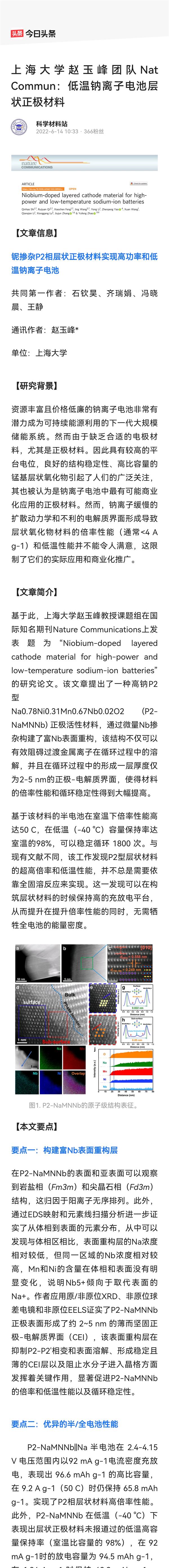 今日頭條:上海大學趙玉峰團隊Nat Commun:低溫鈉離子電池層狀正極材料