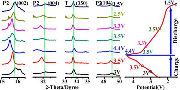Figure6 1.5-4.4V的電勢范圍內以0.1C下在P2+T材料的充電/放電期間收集的非原位XRD圖