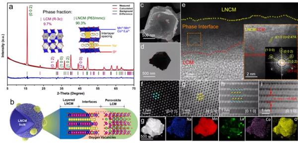 【結(jié)論】1)通過operando XRD研究,驗證了電化學(xué)反應(yīng)過程中固溶體反應(yīng)完全可逆,充放電過程中晶胞參數(shù)變化很小。這可能是由于鑭的微量摻雜使TM層更加無序,抑制了Na+/空位的有序。2)在P2相中摻雜La,可以減小自旋向上通道中的贗隙,從而提高電子電導(dǎo)率。3)La取代Mn,可使Co t2g與O 2p形成較強的共價鍵,在O 2p軌道上形成“空穴”,有利于抑制氧的損失,從而提高結(jié)構(gòu)穩(wěn)定性。4)LNCM表面原位生長的LCM納米島,在兩相界面上提供了豐富的快速離子擴(kuò)散通道,顯著提高了Na+擴(kuò)散系數(shù),顯著提高了速率能力。5)LNCM/LCM界面和LCM鈣鈦礦納米島的豐富缺陷可以提供足夠的氧空位容納O2-離子,從而避免氧損失,促進(jìn)體系整體離子電子平衡。