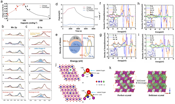 圖4. LNCM/LCM非原位XPS結(jié)果:a. LNCM/LCM在30ma g-1速率下的充放電曲線; 圖5a中各點對應(yīng)的 b. XPS Mn 2p譜圖;和c. XPS O 1s譜圖;d. LNCM/LCM充放電過程中產(chǎn)氣情況的DEMS測試;e. LNCM貧鈉相態(tài)密度示意圖;f-i. DFT計算貧鈉LNCM、貧鈉NCM、LNCM、NCM態(tài)密度;j. LNCM與NCM氧配位比較;k. 有氧空穴和無氧空穴時LCM模擬氧捕獲的模型.