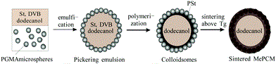 Microcapsules of a phase change material synthesized by thermally sintering Pickering emulsion-based colloidosomes were demonstrated. The protocol included three steps: (1) monodispersive poly(glycidyl methacrylate) (PGMA) microspheres were prepared by dispersive polymerization and were endowed with a contact angle of 63.4° for oil-in-water Pickering stabilization by hydrolysis. (2) By phase separation during Pickering emulsion polymerization, microcapsules with a structure of a single PCM core and a PGMA armored polystyrene shell were fabricated. (3) Thermal sintering was performed to fuse the polystyrene and PGMA microspheres into an integral shell of the microcapsules. The durability of the microcapsules before and after sintering was investigated by a suspension test (in water and ethanol) and an accelerated thermal cycling test. The sintering reduced the percentage of leaked dodecanol from 19.6% to 10.3% in the suspension test in ethanol and from 10.4% to 2.8% in the accelerated cycling test. These results verified that the sintering process endowed the prepared microcapsules with better tightness and durability.
