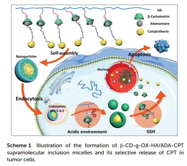 針對腫瘤細胞內存在的高濃度谷胱甘肽(GSH)及酸性環境特性,該課題組利用環糊精修飾的天然多糖透明質酸和金剛烷修飾的抗癌藥物喜樹堿(ADA-CPT),通過環糊精與金剛烷的特異性主客體識別作用,簡單高效地構筑了一類雙重腫瘤微環境刺激響應性納米遞藥體系。在納米藥物載體通過腫瘤組織的EPR作用富集在腫瘤組織中,并進一步被腫瘤細胞內吞后,腫瘤細胞內酸性環境將環糊精與透明質酸相連的pH敏感的亞胺鍵破壞,釋放出環糊精與金剛烷的包合物(β-CD/ADA-CPT),形成粒徑更小的載藥納米體;同時,在高濃度的GSH環境下,ADA-CPT分子中的雙硫鍵結構破壞,進一步釋放出抗癌藥物CPT,實現對腫瘤細胞的殺滅作用。通過利用腫瘤細胞內的酸性環境及高濃度GSH環境,該雙重刺激響應性的納米遞藥體系還可以實現抗癌藥物的分步按需釋放,提供更為靈巧的控制釋放性能。