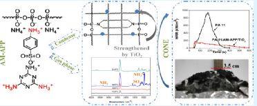 The flammability and melt dripping of the widely used bio-based polyamide 11 (PA 11) have attracted much attention in the last decade, and they are still a big challenge for the fire science society. In this work, a novel single macromolecular intumescent flame retardant (AM-APP) CRI that contains an acid source and a gas source was prepared by supramolecular reactions between melamine and p-amino benzene sulfonic acid, followed by an ionic exchange with ammonium polyphosphate. The chemical structure of AM-APP was characterized by Fourier transform infrared (FTIR) spectroscopy, X-ray photoelectron spectroscopy, and scanning electron microscopy. AM-APP and TiO2 were then introduced into PA 11 by melt compounding to improve the fire resistance of the composite. The fire performance of PA 11 composites was evaluated by the limiting oxygen index (LOI), vertical burning (UL-94), and cone calorimetry tests. The results showed that the presence of 22% AM-APP and 3% TiO2 increased the LOI value from 22.2 to 29.2%, upgraded the UL-94 rating from no rating to V-0, completely eliminated melt dripping, and significantly decreased the peak heat release rate from 943.4 to 177.5 kW/m(2). The thermal behaviors were investigated by thermogravimetric (TG) analysis and TG-FTIR It is suggested that AM-APP produces an intumescent char structure and releases inert gases, whereas TiO2 may consolidate the char layers, leading to the improvement in the fire resistance of PA 11.