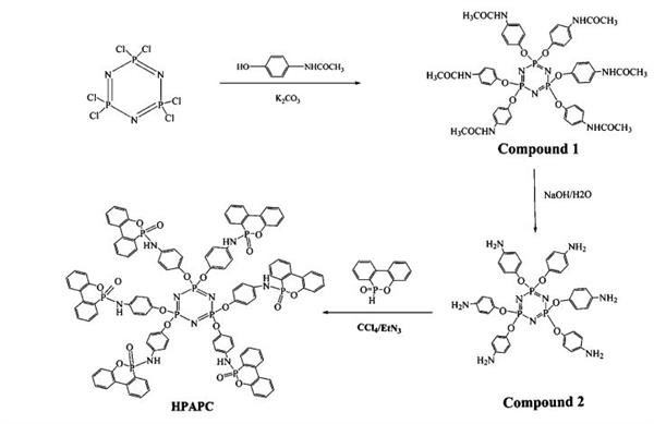 The novel phosphortis/nitrogen=zontainirig flame retardant hexa(phosphaphenarithrene aminophenoxyl)-cyclotriphosphatene (HPAPC), which contains Phosphaphenanthrene [9,10-dihydro-oxa-10,phosphaphenanthrene 10-oxide (DOPO)] and phosphazene (hekachlorocyclotriphosphazene) groups; was synthesized by the classic Atherton-Todd reaction, and its chemical structure was characterized by Fourier transform infrared (FTIR) and nuclear magnetic resonance (NMR) spectroscopies. Poly(lactic acid) (PLA) composites containing HPAPC were prepared by melt blending, and their fire performance and thermal behaviors were investigated in terms of limiting oxygen index (LOT); vertical burning (UL-94), dine calorimeter tests, and thermogravimetric analysis :(TGA). The LOT value could reach up to 347%, and UL 94 Could pass V-0 for the KA composite containing only 5 wt HPAPC, TGA results showed that the char formation of PIA could be significantly improved by the presence of HPAPC. The evolved gas of the Composite was analyzed by FTIR-TGA and pyrolysis gas chromatography/mass spectrometry (Py GC/IVIS). The dispersion of fillers in PLA was observed by:back-scattered electron (BSE). The Chat morphology was Characterized by FTIR Spectroscopy and scanning electronic microscopy (SEM). It was suggested that the ''''''''presence of HPAPC could release ammonia gas during combustion, which was beneficial to the formation of an intumescent Char structure.