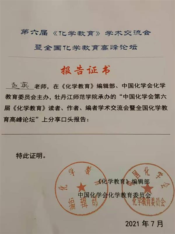 2021年7月趙英副教授參加第六屆《化學(xué)教育》學(xué)術(shù)交流會(huì)-暨全國(guó)化學(xué)教育高峰論壇