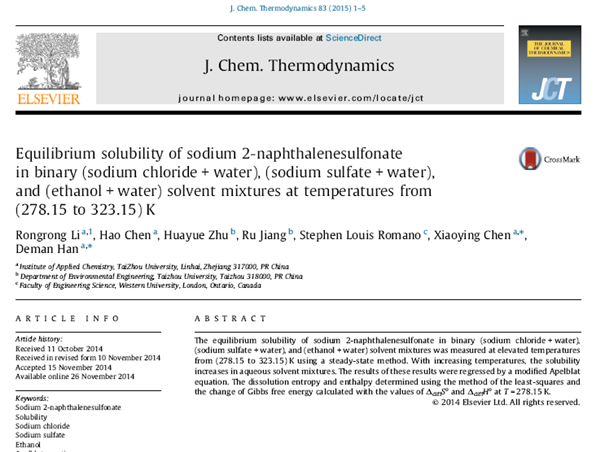 42. Quilibrium Solubility of Sodium 2-Naphthalenesulfonate in Binary Sodium Chloride + Water, Sodium Sulfate + Water, and Ethanol + Water Solvent Mixtures from 278.15 K to 323.15 K