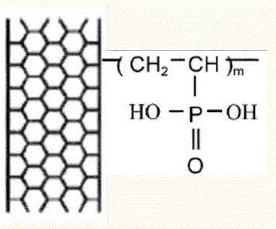 本發(fā)明公開一種聚合物接枝碳納米管及其制備方法。該方法先將單體乙烯基磷酸和碳納米管加入到二甲基乙酰胺中進(jìn)行超聲;氮?dú)獗Wo(hù)下,加入偶氮二異丁腈引發(fā)反應(yīng),繼續(xù)超聲。再將反應(yīng)裝置轉(zhuǎn)移到油浴中,控制溫度直至反應(yīng)結(jié)束,即可得到聚乙烯基磷酸接枝碳納米管。本發(fā)明所涉及的制備方法工藝合理,反應(yīng)操作簡(jiǎn)單,可以明顯提高碳納米管在水中的分散性。該聚合物接枝碳納米管結(jié)構(gòu)表達(dá)式如下: